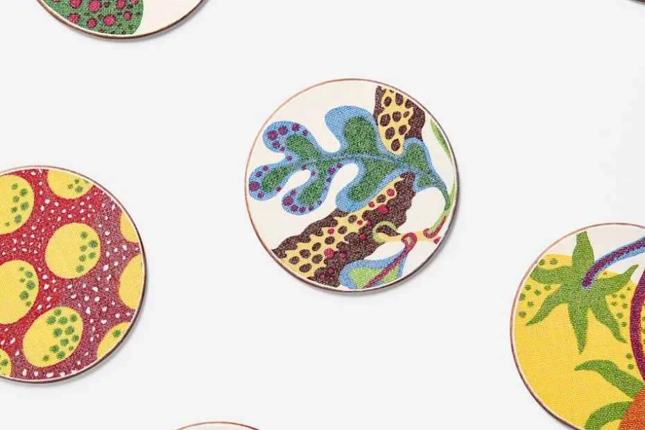 Svenskt Tenns glasunderlägg finns i flera av Josef Franks färgstarka mönster och passar såväl till vardag som till fest. Underläggen säljs i 6-pack. Vegetable Tree är en variant av livsträdstemat som Josef Frank ofta använde sig av och som med glimten i ögat har stöpts om till ett grönsaksträd. I detta mönster stiliserar Josef Frank formerna, höjer färgstyrkan och blandar naturtroget och fantasirikt för att väcka förundran. Mönstret formgavs under Josef Franks år i New York, 1943-1945.