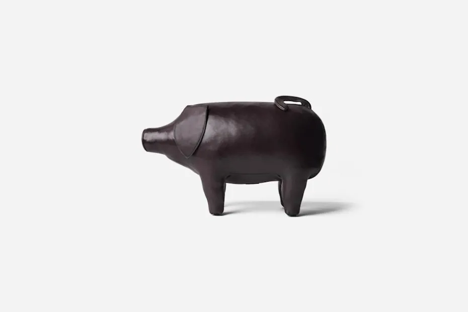 Grisen i skinn kan användas som fotpall eller som inredningsdetalj i hemmet. Den är tillverkad av engelska Omersa, som grundades i London 1927 – då den allra första grisen kom till. Det mjuka skinnet är färgat för hand till en djup, mahognybrun ton och har därefter vaxats och polerats för att skapa en elegant finish.