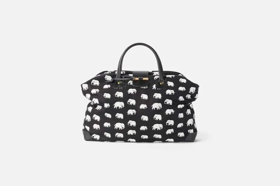 Svenskt Tenns klassiska handväska är dekorerad med en dragkedja och knäppning i mässing samt läderdetaljer. Invändigt finns en avtagbar nyckelring samt en ficka. Estrid Ericson har gjort mönsterdesignen och Svenskt Tenn har tagit fram formen. Svenskt Tenns grundare Estrid Ericson reste mycket till olika platser runt om i världen. Hon letade alltid efter vackra föremål, textilier och souvenirer att ta hem och sälja i butiken på Strandvägen. Det var efter en förlaga från Belgiska Kongo som hon formgav mönstret med de små elefanterna. Svenskt Tenn tryckte textil Elefant för första gången i slutet av 1930-talet.
