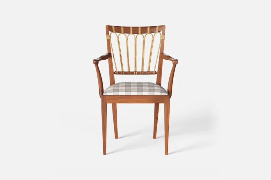 Efter sin återkomst till Stockholm från New York år 1946, formgav Josef Frank denna eleganta karmstol. Stolen har en genombruten rygg bestående av lindad rotting. För att skapa spänning i formen valde Josef Frank ofta att blanda olika träslag och material.