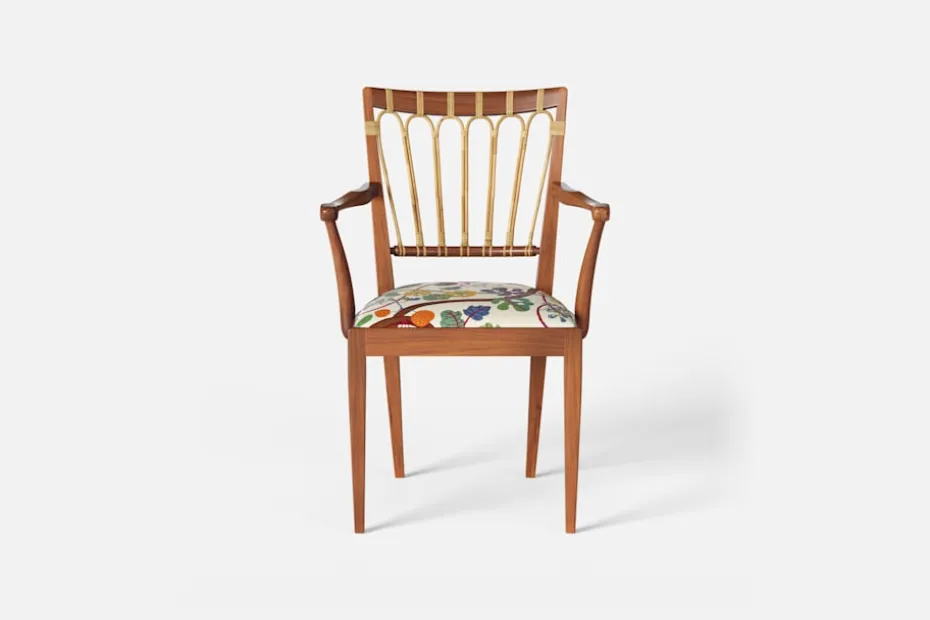 Efter sin återkomst till Stockholm från New York år 1946, formgav Josef Frank denna eleganta karmstol. Stolen har en genombruten rygg bestående av lindad rotting. För att skapa spänning i formen valde Josef Frank ofta att blanda olika träslag och material.