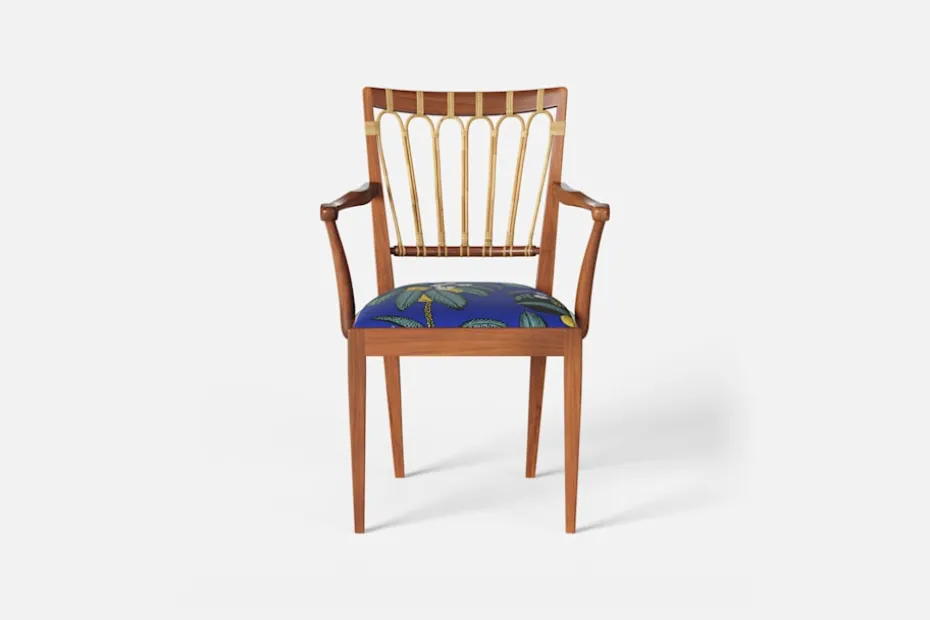 Efter sin återkomst till Stockholm från New York år 1946, formgav Josef Frank denna eleganta karmstol. Stolen har en genombruten rygg bestående av lindad rotting. För att skapa spänning i formen valde Josef Frank ofta att blanda olika träslag och material.