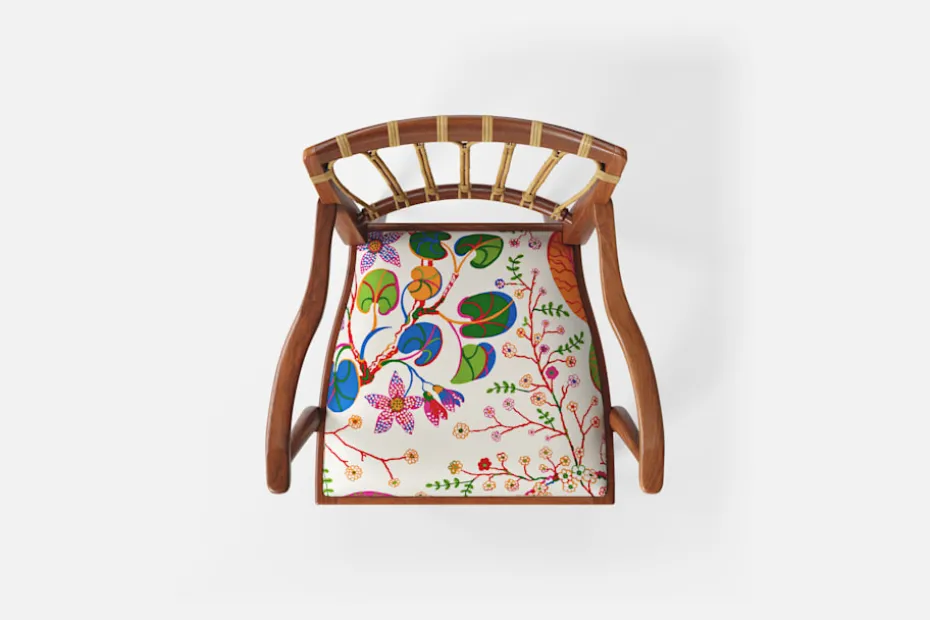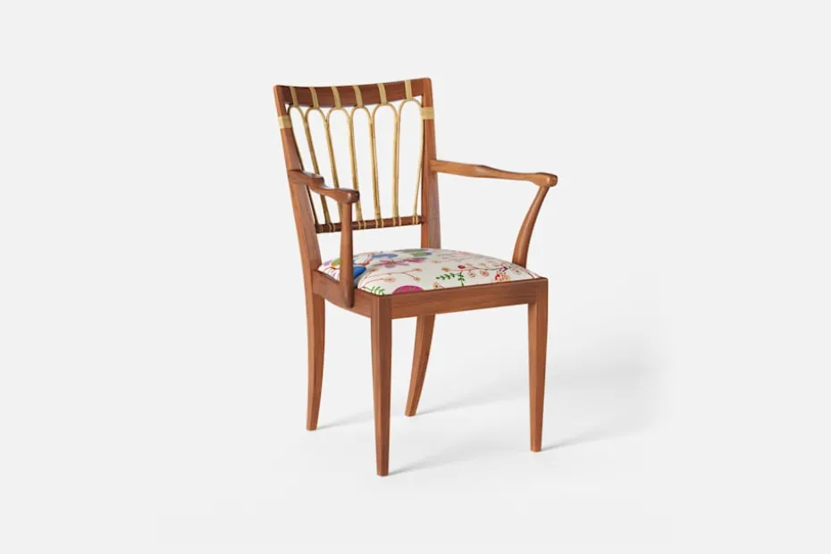 Efter sin återkomst till Stockholm från New York år 1946, formgav Josef Frank denna eleganta karmstol. Stolen har en genombruten rygg bestående av lindad rotting. För att skapa spänning i formen valde Josef Frank ofta att blanda olika träslag och material.