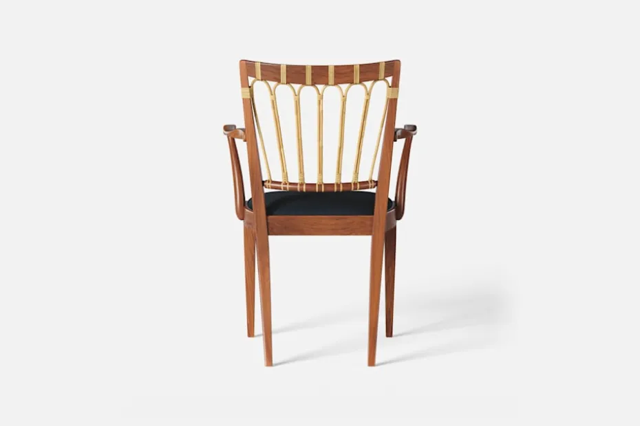 Efter sin återkomst till Stockholm från New York år 1946, formgav Josef Frank denna eleganta karmstol. Stolen har en genombruten rygg bestående av lindad rotting. För att skapa spänning i formen valde Josef Frank ofta att blanda olika träslag och material.