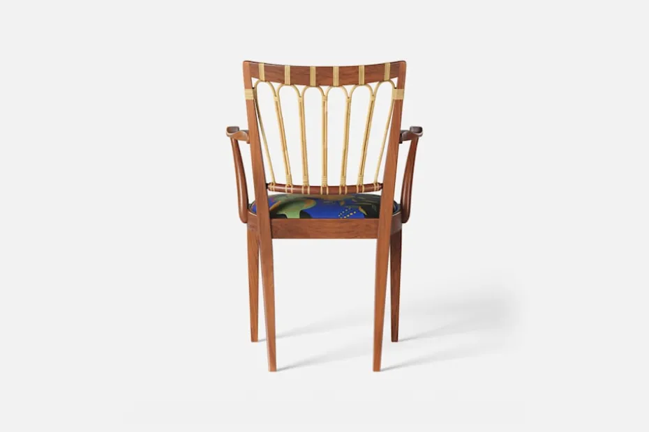 Efter sin återkomst till Stockholm från New York år 1946, formgav Josef Frank denna eleganta karmstol. Stolen har en genombruten rygg bestående av lindad rotting. För att skapa spänning i formen valde Josef Frank ofta att blanda olika träslag och material.