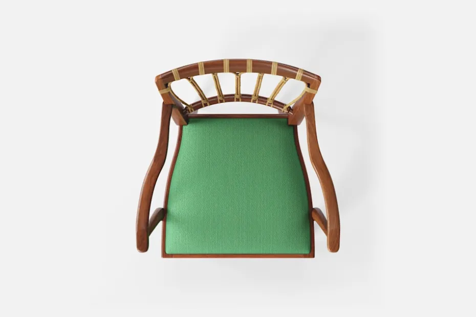 Efter sin återkomst till Stockholm från New York år 1946, formgav Josef Frank denna eleganta karmstol. Stolen har en genombruten rygg bestående av lindad rotting. För att skapa spänning i formen valde Josef Frank ofta att blanda olika träslag och material.