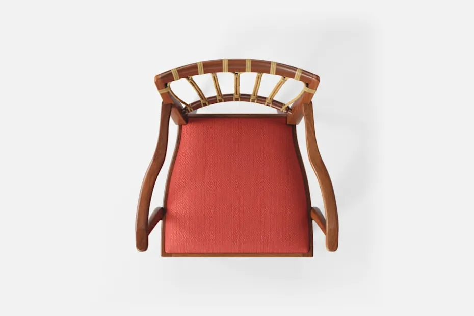 Efter sin återkomst till Stockholm från New York år 1946, formgav Josef Frank denna eleganta karmstol. Stolen har en genombruten rygg bestående av lindad rotting. För att skapa spänning i formen valde Josef Frank ofta att blanda olika träslag och material.