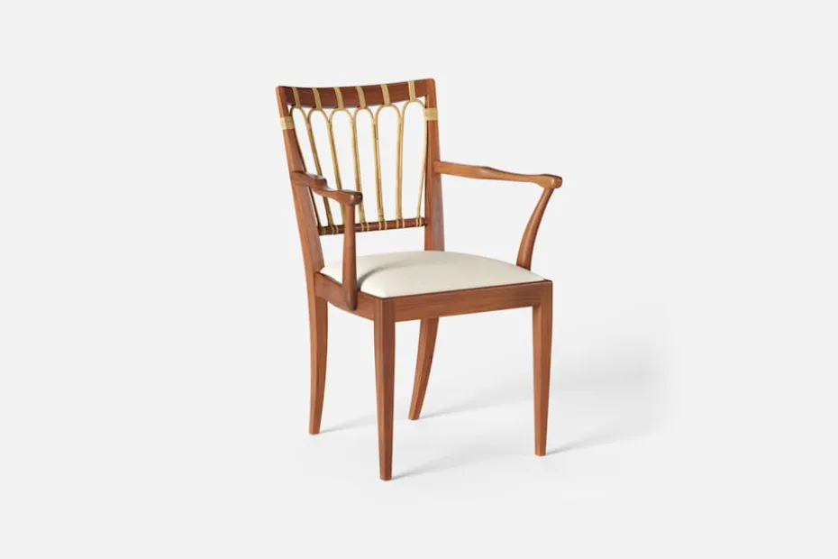 Efter sin återkomst till Stockholm från New York år 1946, formgav Josef Frank denna eleganta karmstol. Stolen har en genombruten rygg bestående av lindad rotting. För att skapa spänning i formen valde Josef Frank ofta att blanda olika träslag och material.