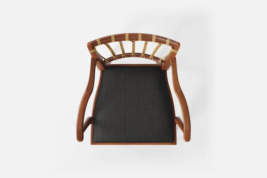 Efter sin återkomst till Stockholm från New York år 1946, formgav Josef Frank denna eleganta karmstol. Stolen har en genombruten rygg bestående av lindad rotting. För att skapa spänning i formen valde Josef Frank ofta att blanda olika träslag och material.