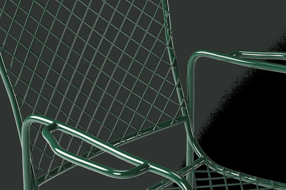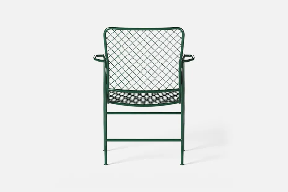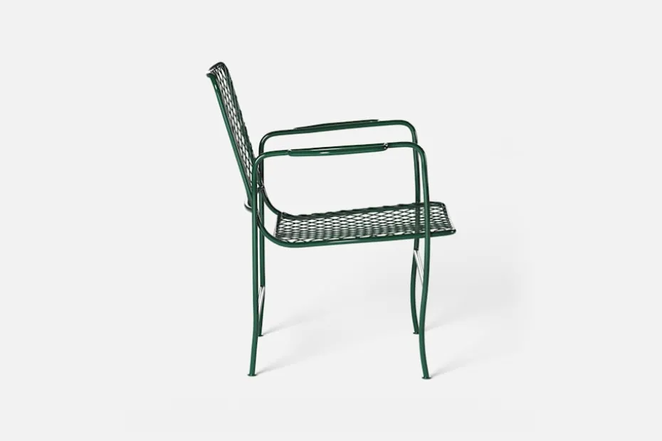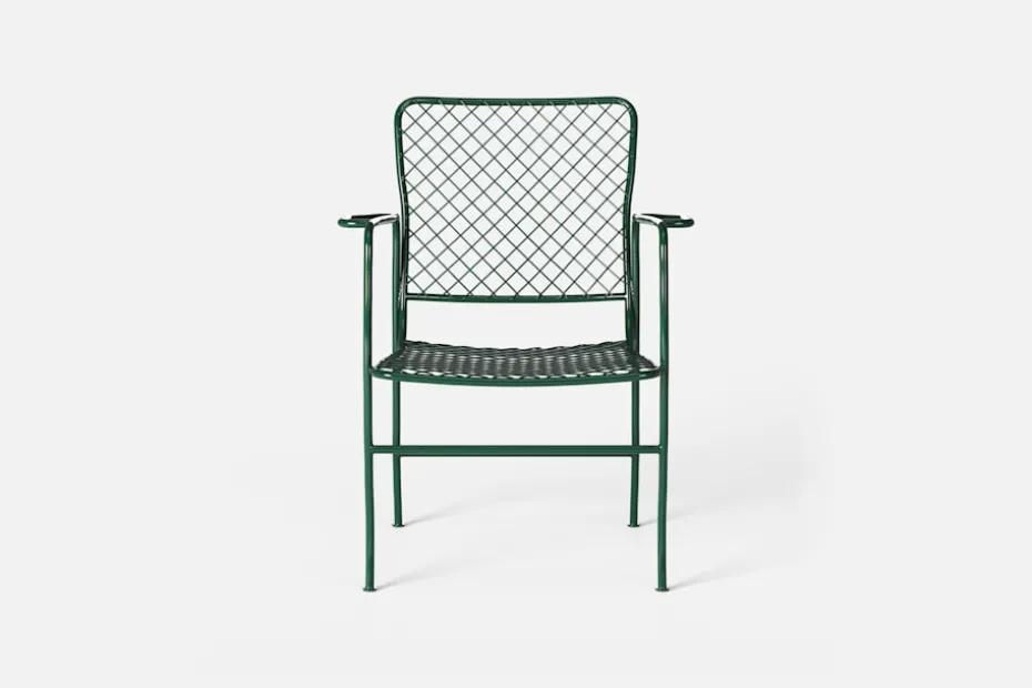 Trädgårdsmöbeln i lackerat järn med genombruten nätdekor i rygg och sits formgavs Josef Frank i mitten av 1930-talet. Den här typen av stålrörsmöbler var populära inom den funktionalistiska stilen som gjort sitt intåg i Sverige. I karmstol 591 har Josef Frank bytt ut det då ofta förekommande kromet mot den varma lackfärgen.