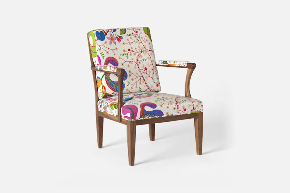 I formgivningen av karmstol 868 inspirerades Josef Frank av 1700-talets nätta karmstolar med elegant svängda armstöd och raka ben. Han formgav stolen 1938.