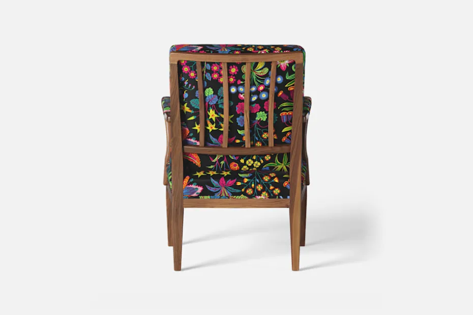 I formgivningen av karmstol 868 inspirerades Josef Frank av 1700-talets nätta karmstolar med elegant svängda armstöd och raka ben. Han formgav stolen 1938.