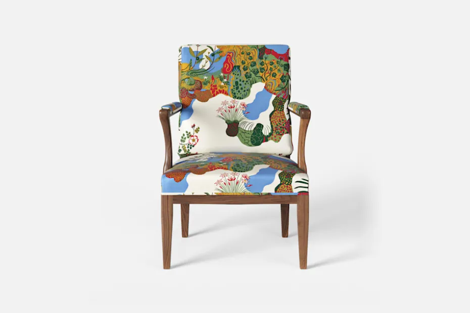I formgivningen av karmstol 868 inspirerades Josef Frank av 1700-talets nätta karmstolar med elegant svängda armstöd och raka ben. Han formgav stolen 1938.