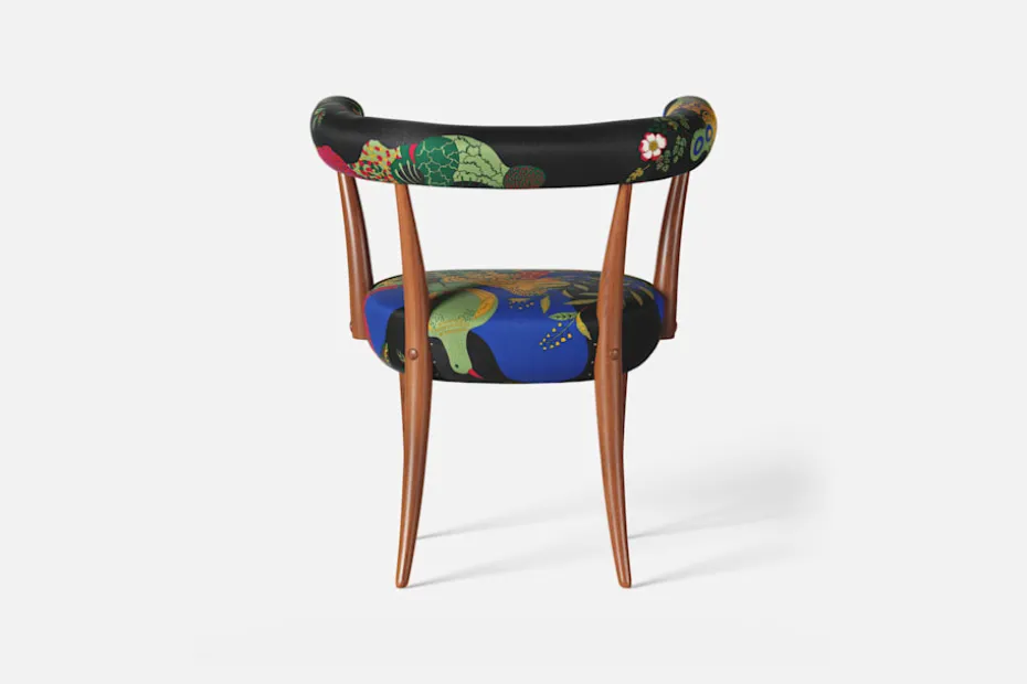 Josef Frank formgav Karmstol 966 för Svenskt Tenn 1938. Stolen visades i samband med Världsutställningen i New York 1939, där Svenskt Tenn gjorde stor succé med sin nytänkande formgivning. Den hästskoformade ryggbrickan och de utsvängda benen vittnar om en viss inspiration från antikens klismos- och sullastolar. Karmstolen finns i Estrid Ericsons inredning på Tolvekarna 1952 klädd i leopardmönstrad textil.