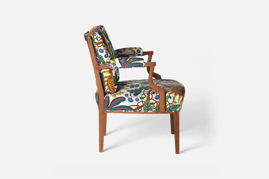 Med inspiration från 1700-talets nätta karmstolar formgav Josef Frank karmstol 969. För att skapa spänning i formgivningen valde Josef Frank ofta att blanda olika träslag och material. Karmstol 969 är gjord i mahogny med infällning av rotting i ryggen bakom den löstagbara kudden. Stolen formgavs 1939 och finns i två olika sitthöjder.