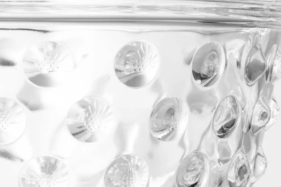 Krukan har en tunn skarv i glaset som uppkommer då den är pressad i en delbar gjutform. Den poleras i efterbearbetningen, men spår av den hantverksmässiga produktionen finns alltid kvar på slutprodukten.