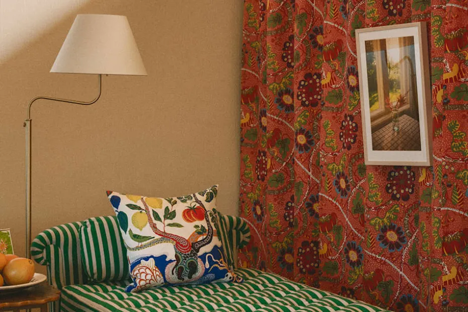 Svenskt Tenns klassiska kuddar är omtyckta världen över; från Stockholm till New York och Shanghai. Denna kudde i linnekretong har mönstret Italian Dinner. Grönsaksplantor från Italien var otvetydigt Josef Franks inspiration till mönstret Italian Dinner. Stammar, blad och fruktformer bildar vertikala stråk med en olivkvist i centrum. Horisontella vattendrag med gulstrimmig mullus, bläckfisk, musslor och hummer balanserar kompositionen. Josef Frank formgav mönstret under 1943-1945.