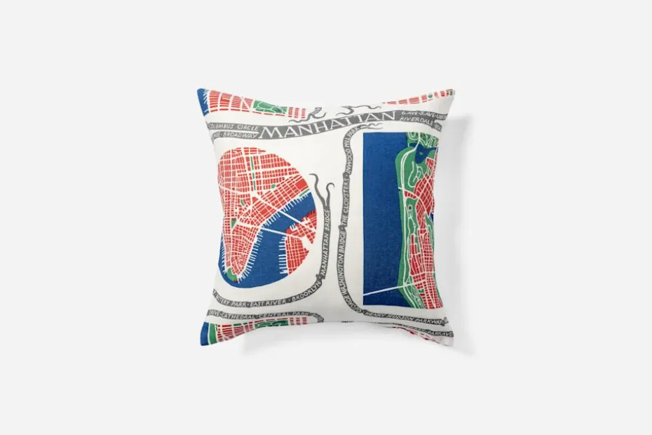 Svenskt Tenns klassiska kuddar är omtyckta världen över; från Stockholm till New York och Shanghai. Denna kudde i linnekretong har mönstret Manhattan. Under åren 1941-1946 bor och arbetar Josef Frank i New York. Han finner stadsplanen intressant i sin förenkling och skapar därför mönstret Manhattan, som visar öns karta.