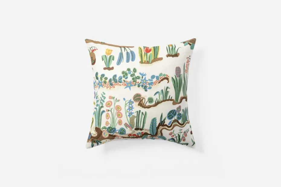 Svenskt Tenns klassiska kuddar är omtyckta världen över; från Stockholm till New York och Shanghai. Denna kudde i linnekretong har mönstret Primavera. Primavera är det italienska ordet för vår. I de horisontella rabatterna i detta mönster växer de flesta av våra mest bekanta vårblommor: Tulpan, Scilla, Hyacint, Bellis, Viol, Anemon och Förgätmigej. Mönstret komponerades av Josef Frank redan i början av 1920-talet.