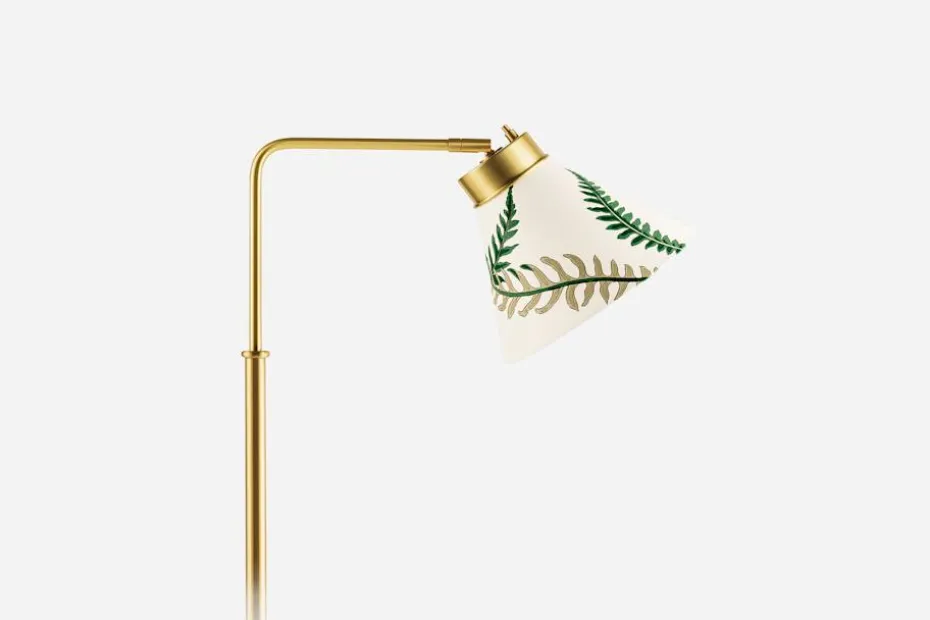 Denna lampskärm är tillverkad i bomullstextilen Stensöta. Svenskt Tenns grundare Estrid Ericson reste mycket till olika platser runt om i världen. Hon letade alltid efter vackra föremål och textilier att ta hem och sälja i butiken på Strandvägen. Textil Stensöta kommer från det engelska textilföretaget GP & J Baker, som i sin formgivning ofta hämtade inspiration från historiska mönstertraditioner. Estrid Ericson började köpa in textil från dem redan under 1930-talet. Det klassiska mönstret Stensöta är den enda textilen från GP & J Baker i Svenskt Tenns sortiment som inte är formgiven av William Turner. Motivet skapades istället av Joseph M Doran, som öppnade sin egen studio i Hounslow i början av 1900-talet. GP & J Baker samarbetade med honom från 1912 till 1936. Stensöta köptes in i januari 1935. Motivet är sprunget ur botaniska ritningar publicerade i Curtis Flora Londinensis mellan 1777 och 1798 (ett register över växter som växer inom en radie på tio mil från London).