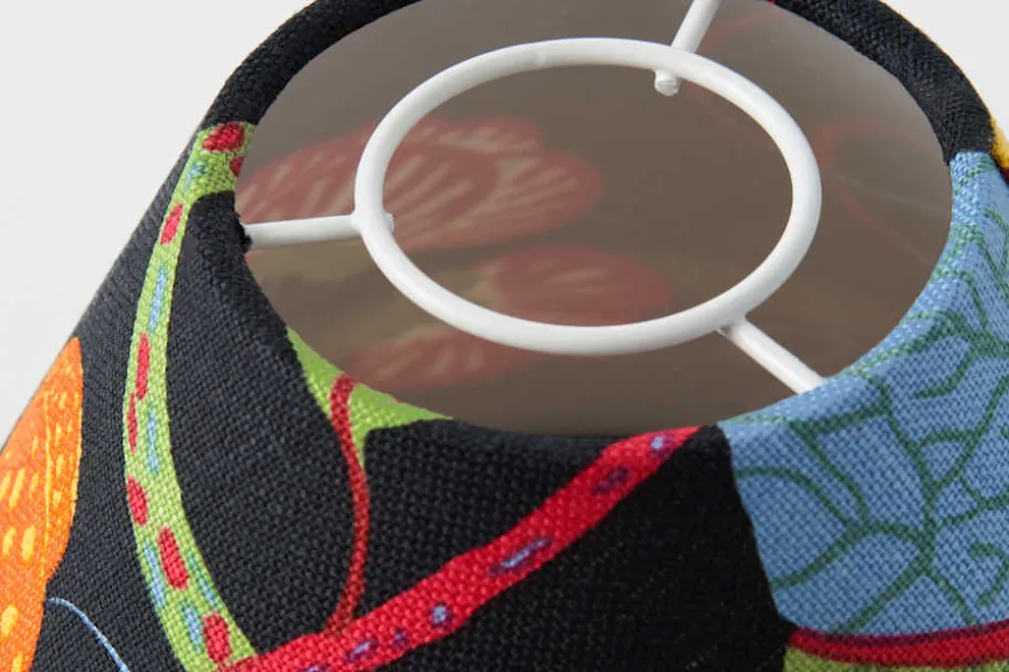 Josef Frank formgav en lampskärm till varje modell av sina lampor. Ursprungligen var de alla i vit textil, men Estrid Ericson lät senare sy upp dem med mönster av Josef Frank och andra formgivare. Denna lampskärm i linnekretong har mönstret Baranquilla. I Josef Franks textil ”Baranquilla” skapar fyra, kärleksfullt utformade lianstammar en vacker helhet fylld av prunkande frukter, blommor och blad. Mönstret ritades 1943-45, under Josef Franks tid i New York – där många av hans fantasifulla mönster med fritt växande livsträd, blommor och frukter tog form. Baranquilla fick sitt namn efter den colombianska hamnstaden vid det Karibiska havet, som Josef Frank och hans fru Anna passerade under exilen från Sverige till Amerika 1941, mitt under brinnande världskrig.