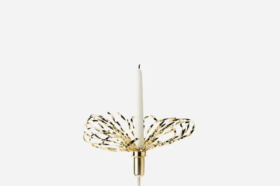 Ljusmanschetterna Jubel i mässing förmedlar känslan av fyrverkerier och bubblande Champagne. De är formgivna av smyckekonstnären och silversmeden Karin Ferner för Svenskt Tenns jul 2024.