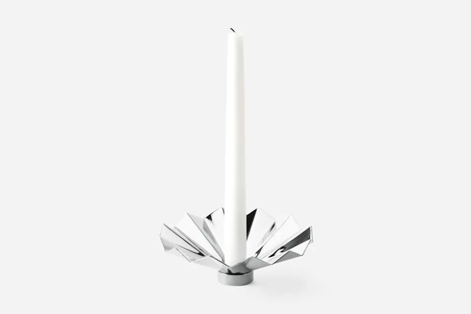 En elegant ljusmanschett som för tankarna till högtid och fest, skapad av formgivaren Ulla Christiansson. Den veckade formen framkallar en vacker spegelreflex över det dukade bordet. En stämningshöjare för alla tillfällen som passar såväl Svenskt Tenns låga ljushållare som den höga ljusstaken Gala av Ulla Christiansson.