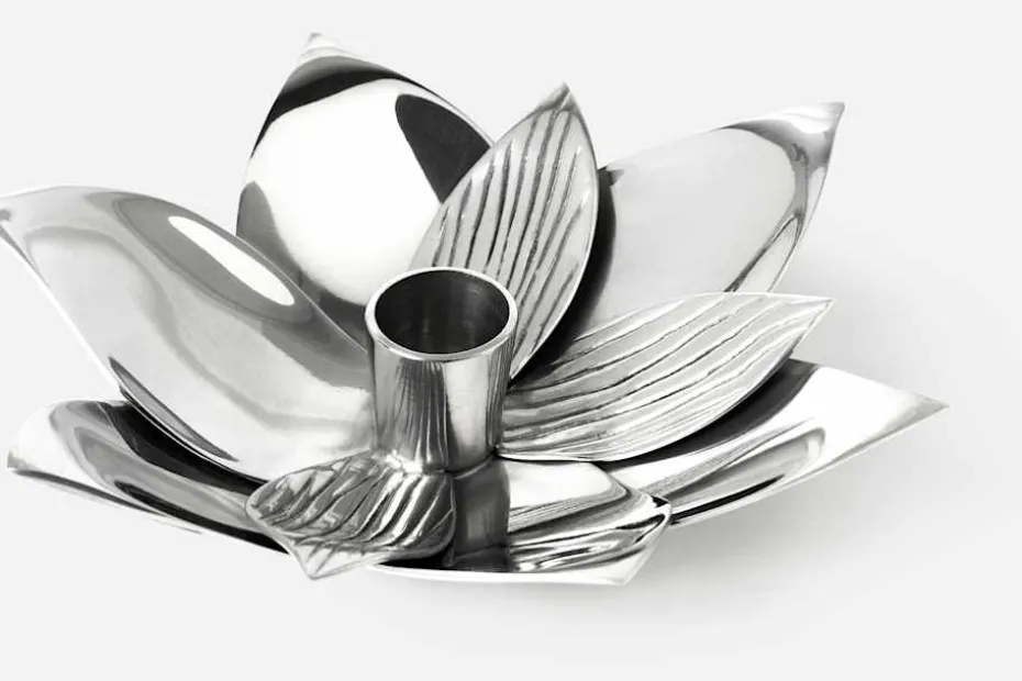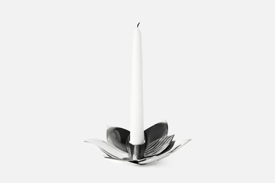 Ljusstaken som liknar en fullt utslagen lotus formgav arkitekt Björn Trägårdh 1929. Från början var ljusstaken en specialbeställning från en Mrs Isabelle Clow i Chicago, innan den skickades över till USA ställdes den ut på Nationalmuseum. Läs mer om Tennets färd till Strandvägen i Svenskt Tenns Magasin.