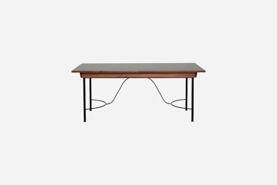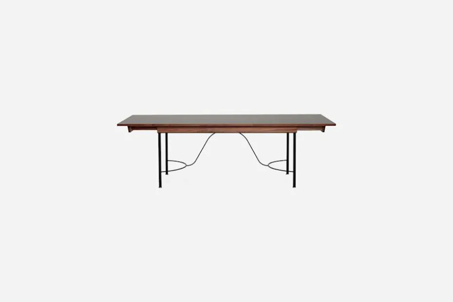 Josef Frank formgav Matbord 884 år 1938. Att blanda olika material var typiskt för Josef Franks formgivning. Här möter skivan i lackat linoleum och valnöt ett stativ av järn med avslutning av mässingsfötter.