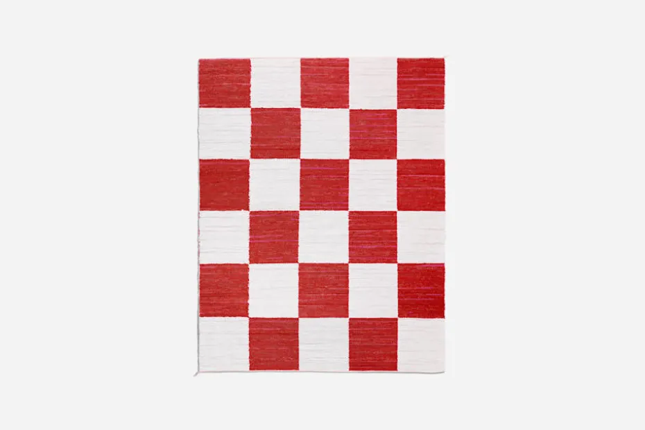 Svenskt Tenns dubbelvävda trasmatta ”Schackrutan” är formgiven av Margit Thorén under 1940-talet.