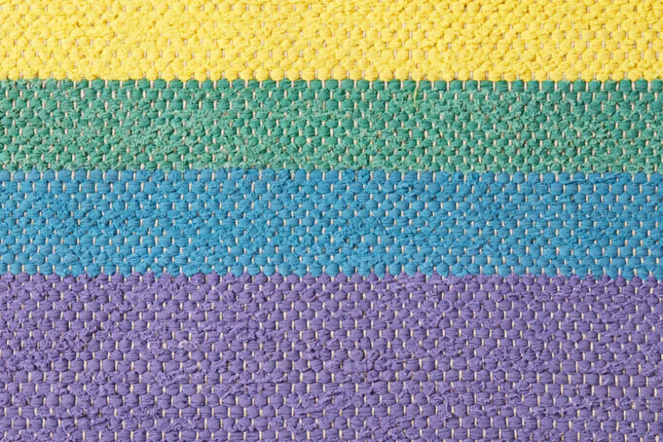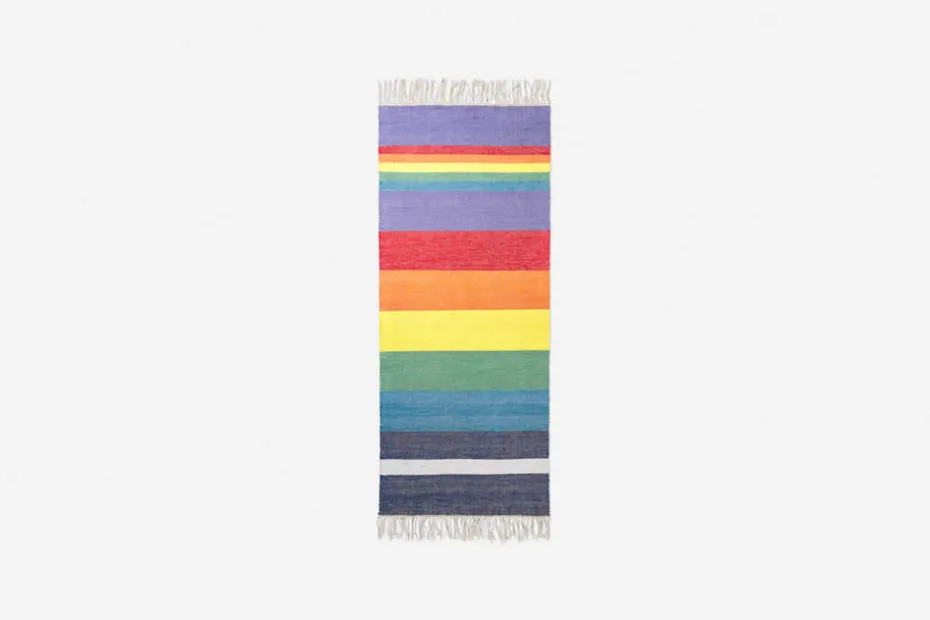 I början kan remsorna fälla trådar. Detta är en del av mattans utseende och karaktär och kommer att avta med tiden. Mattan är vävd av resttyger från produktionen av Svenskt Tenns linnetyg och Josef Franks textilier.