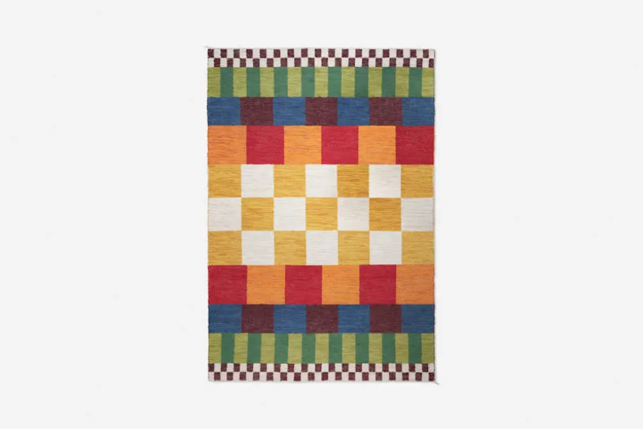 I början kan remsorna fälla trådar. Detta är en del av mattans utseende och karaktär och kommer att avta med tiden. Mattan är vävd av resttyger från produktionen av Svenskt Tenns linnetyg och Josef Franks textilier.