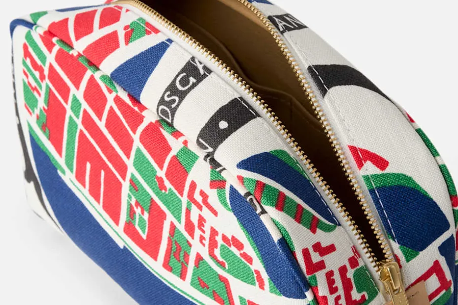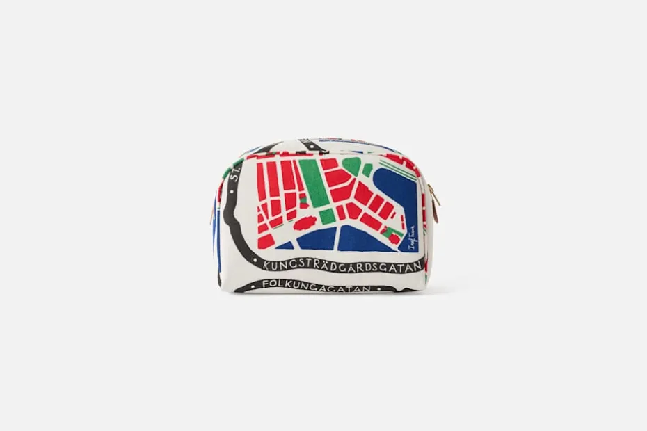 Både vacker och praktisk är necessären, med dragkedja i mässing och mönster Svenskt Tenn Est. 1924 av Josef Frank.