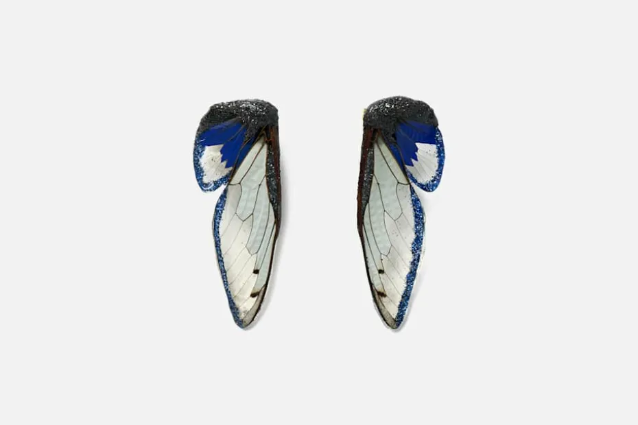 Unika örhängen i form av vingar, skapade av smyckekonstnären Märta Mattsson. I sitt skapande ser Märta det vackra i sådant som kan uppfattas som avstötande. Hon omvandlar döda djur och insekter till smycken och ger dem på så vis ett nytt liv och ett nytt syfte.