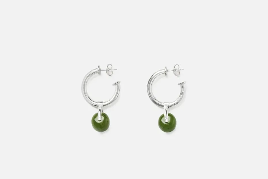 Små, vackra creolörhängen i återvunnet silver med rörligt hänge och antik jadepärla i grönt. Örhängena är skapade av formgivarduon Murky, som tillsammans skapar smycken med rörliga detaljer och hämtar inspiration från det lilla fröets stora betydelse. Murky består av formgivarna Emelica Lidman och Mike Årsjö. De använder sig av både odlade och naturpärlor, gärna med naturliga och unika former. Smyckena tillverkar de för hand i Stockholm, alltid i återvunnet silver.