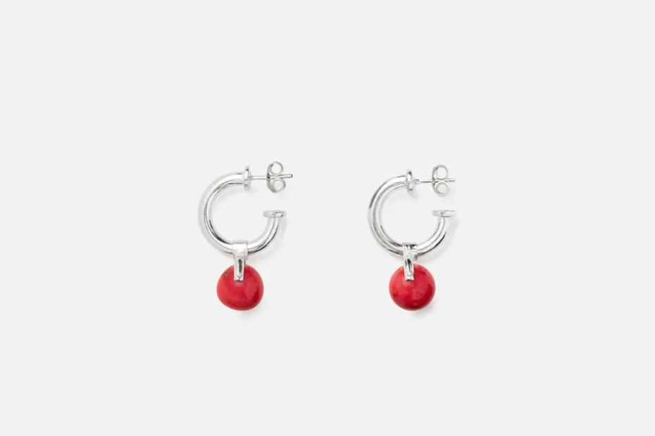 Små, vackra creolörhängen i återvunnet silver med rörligt hänge och rund korall från 1960-70-talet. Örhängena är skapade av formgivarduon Murky, som tillsammans skapar smycken med rörliga detaljer och hämtar inspiration från det lilla fröets stora betydelse. Murky består av formgivarna Emelica Lidman och Mike Årsjö. De använder sig av både odlade och naturpärlor, gärna med naturliga och unika former. Smyckena tillverkar de för hand i Stockholm, alltid i återvunnet silver.