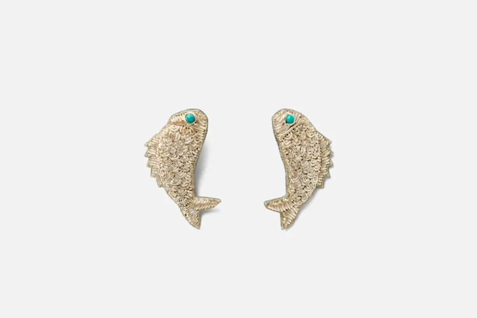 Dessa vackert broderade, fiskformade örhängen med pärlor är formgivna av smyckekonstnären Sophia Edstrand. Örhängena är lätta i vikt och bekväma att bära. Det unika uttrycket gör dem till enastående smycken som håller över tid. Varje smycke från Sophia 203 tillverkas för hand av skickliga hantverkare i Jaipur, där trådar av silke och zari broderas på en bas av mjuk sammet. Resultatet är ett detaljrikt och slående vackert hantverk.