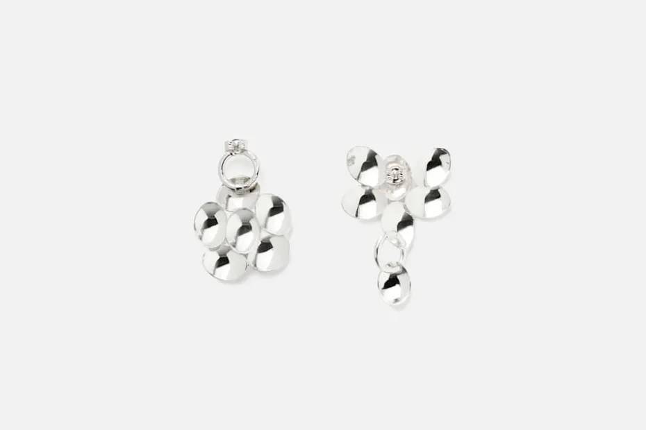 Små, vackra örhängen i återvunnet silver, med skira blad som löds ihop för hand och tillsammans skapar en växande form. Detta arbetssätt gör varje örhänge unikt i sin form. Örhängena är skapade av formgivarduon Murky, som tillsammans skapar smycken med rörliga detaljer och hämtar inspiration från det lilla fröets stora betydelse. Murky består av formgivarna Emelica Lidman och Mike Årsjö. De använder sig av både odlade och naturpärlor, gärna med naturliga och unika former. Smyckena tillverkar de för hand i Stockholm, alltid i återvunnet silver.
