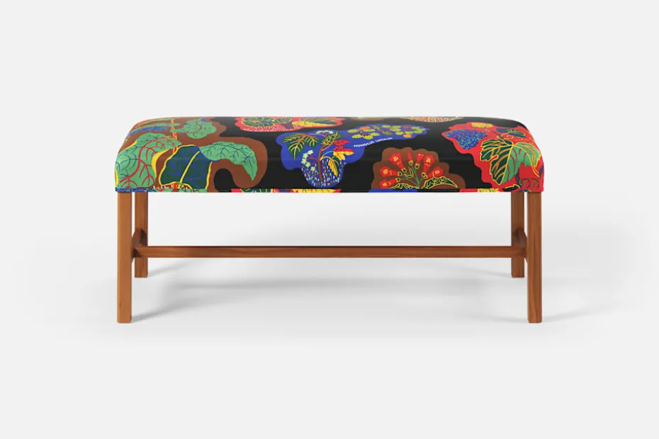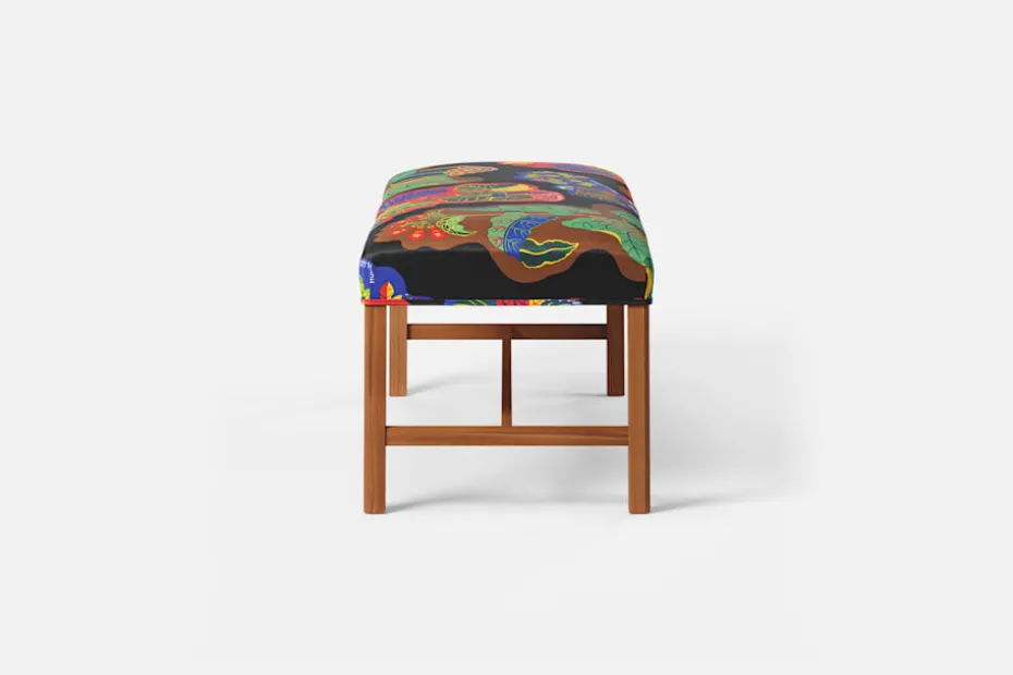 Denna rektangulära, stramt utformade pall med sits i tyg eller skinn formgavs av Josef Frank år 1950. De fyrkantiga benen har den typiska hörnprofileringen som kännetecknar Josef Franks formgivning. Benställningens H-kryss för tankarna till 1700-talets möbelformgivning.