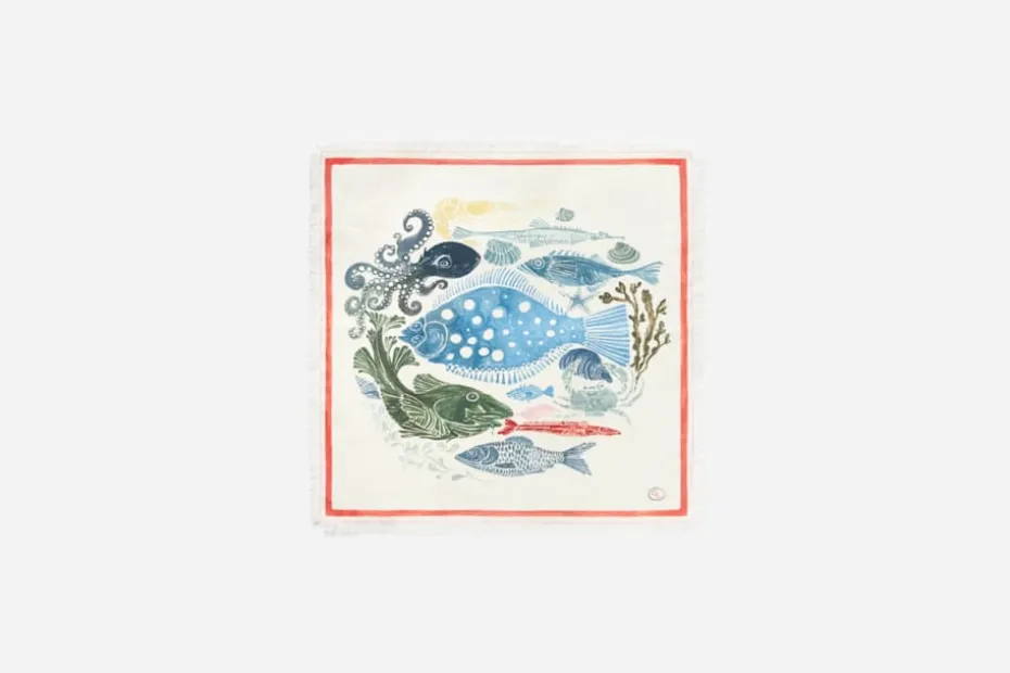 Den här dekorativa linneservetten kan användas såväl till vardag som till fest, perfekt till sommarens alla dukningar. Fantasifiskar i olika storlekar rör sig i stim över mönstret, designat av den danska smyckesformgivaren Charlotte Lynggaard för Svenskt Tenn. I dukningskollektionen The North Sea har hon kombinerat sin passion för dukningar med kärleken till fiskar, som hon menar väcker både drömmar och förundran. Designen är bland annat en tolkning av de fiskar som lever i havet utanför hennes hus i Öresund, en plats mellan Sverige och Danmark.