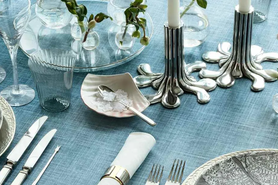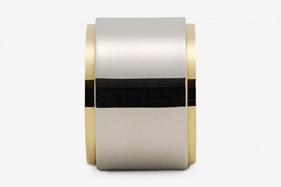 Den stilrena servettringen formgavs av Sebastian Schildt 2002 med ett yttre hölje av tenn och en inre ring av mässing. Formspråket påminner om tidiga Svenskt Tenn produkter från 1920-talet. Servettringen passar både till vardag och till fest.