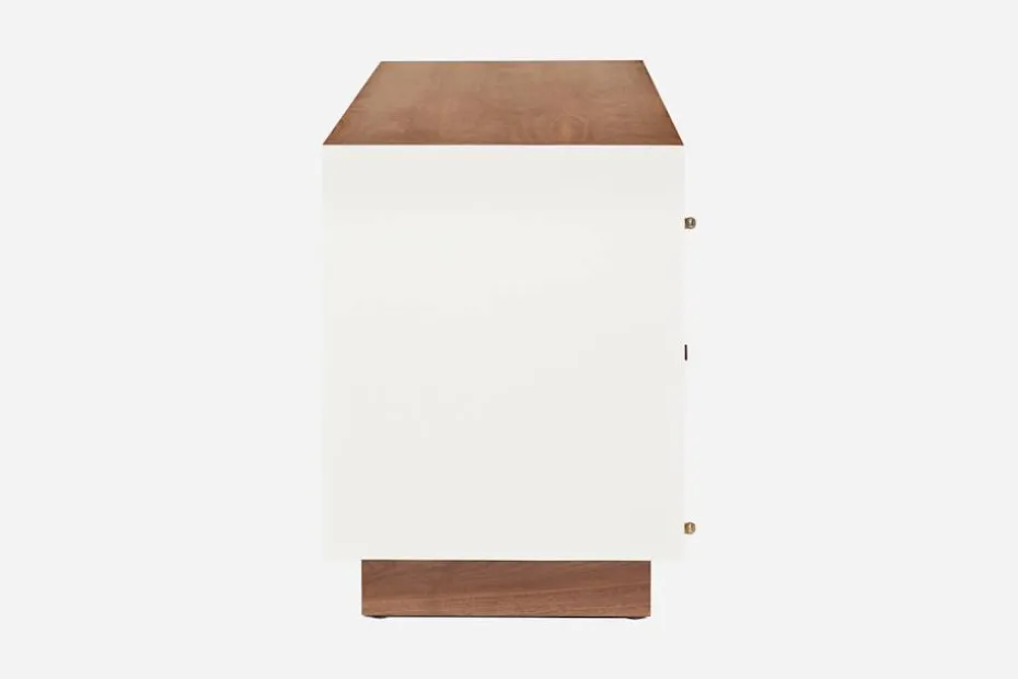 Vitlackerad björk med toppskiva, sockel och övriga trädetaljer i valnöt. Fem stycken lådor med handtag av mässing. Två låsbara dörrpar. Bordet är hantverksmässigt tillverkad i Sverige. Varje bord är unikt och träytan kan variera från utförandet på bilden. Samtliga Svenskt Tenns nyproducerade möbler är försedda med en plakett som visar att möbeln är äkta.