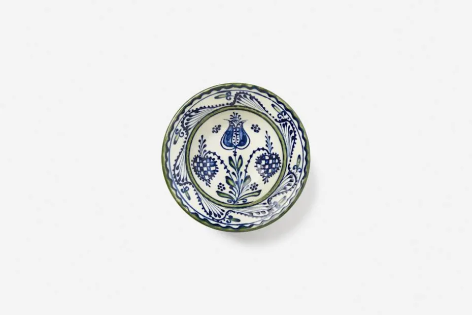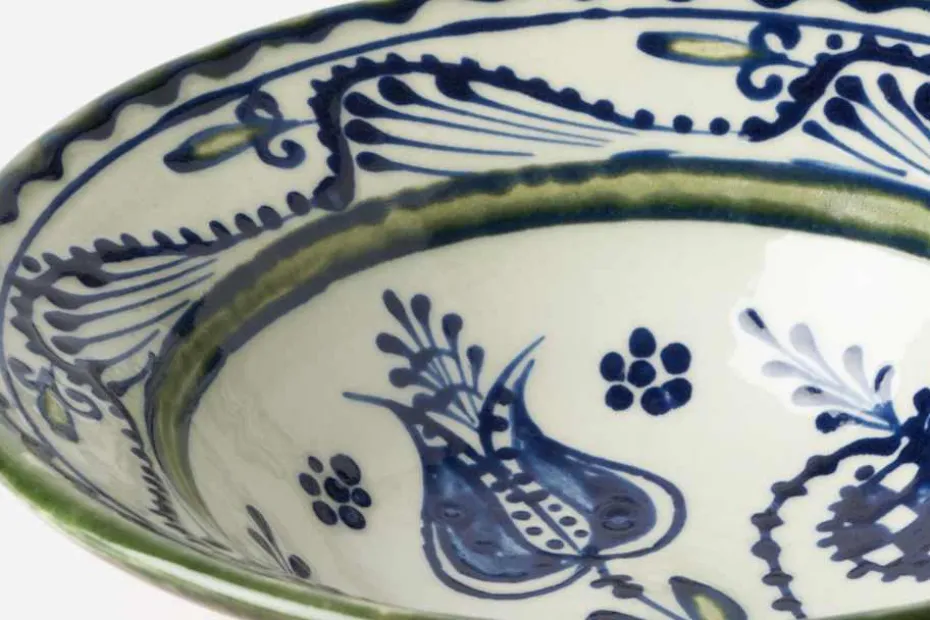 Denna porslinsservis med blå blommor drejas och målas för hand i Rumänien. Den är skapad efter antika, transsylvaniska keramikföremål som bär kulturella influenser från Balkan och Italien i söder, Europa i väster och Osmanska riket och Asien i öster. Keramiken bränns tre gånger i över 1000 grader, vilket gör färgerna skarpa och klara.