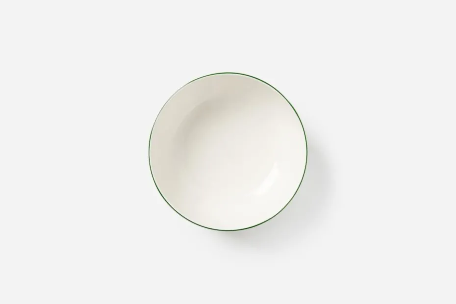 En enkel, klassisk och elegant middagsservis från franska Gien. Den skira gröna kantlinjen är handmålad på varje porslinsföremål, och den gröna färgen är framtagen exklusivt för Svenskt Tenn.