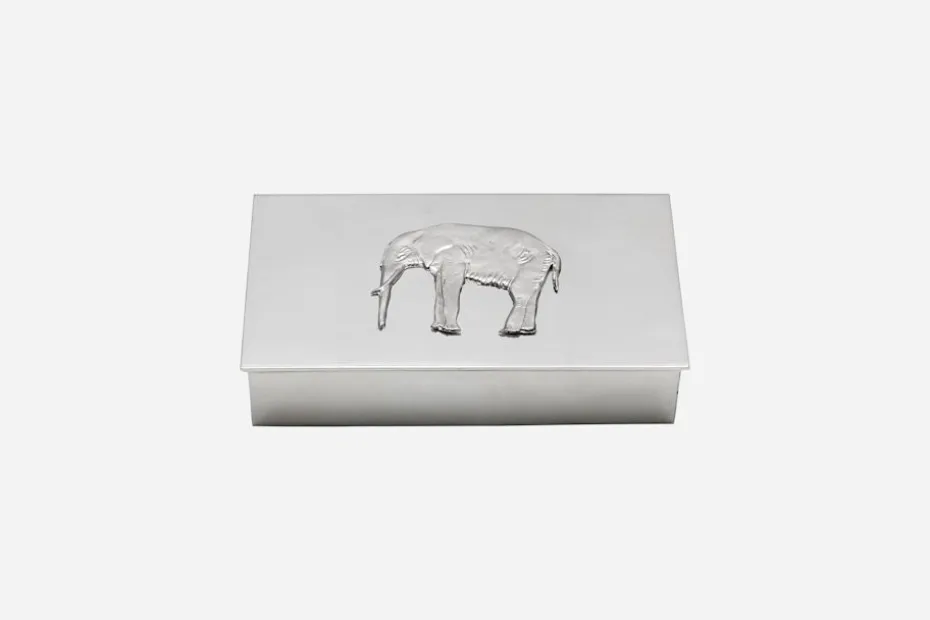 Estrid Ericson reste mycket och samlade under sina resor på sig olika slags saker och mönster. Att pryda ett föremål genom att addera ett annat objekt var något som hon gjorde ofta. Tennskrinet är dekorerat med en zebra, en elefant, en gepard eller ett lejon. Samtliga är tillverkade med inspiration från förlagor ur Estrid Ericsons arkiv.