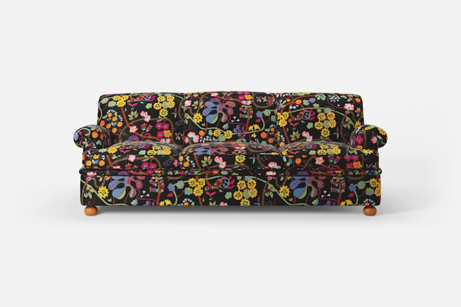 Josef Frank formgav den här långa, rymliga soffan under 1930-talets andra hälft. Ryggpartiet delas av rep vilket utgör en spännande dekor. Enligt Josef Frank skulle också det moderna hemmet vara en plats för vila och bekvämlighet, sittplymåer och dubbla fjädersystem ger en utmärkt komfort.