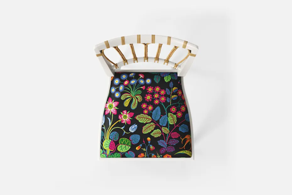Stol 1165 har en genombruten rygg bestående av lindad rotting. För att skapa en spänning i formen valde Josef Frank ofta att blanda olika träslag och material. Stol 1165 formgavs av Josef Frank 1947.