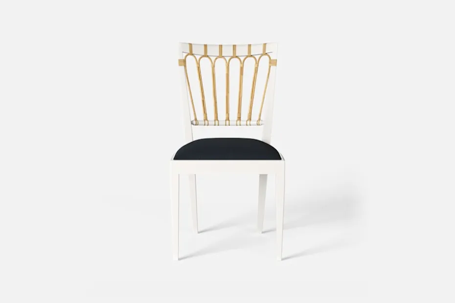 Stol 1165 har en genombruten rygg bestående av lindad rotting. För att skapa en spänning i formen valde Josef Frank ofta att blanda olika träslag och material. Stol 1165 formgavs av Josef Frank 1947.