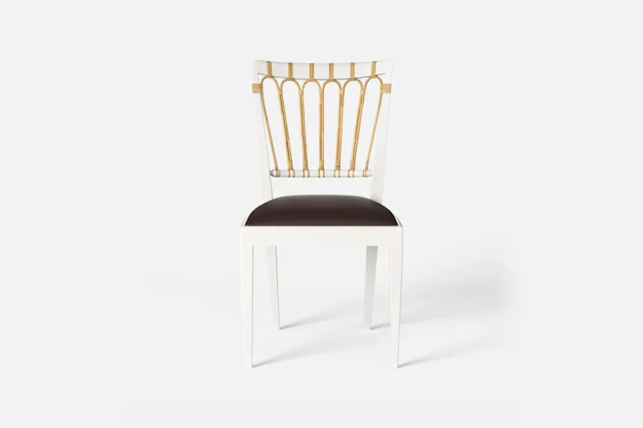 Stol 1165 har en genombruten rygg bestående av lindad rotting. För att skapa en spänning i formen valde Josef Frank ofta att blanda olika träslag och material. Stol 1165 formgavs av Josef Frank 1947.