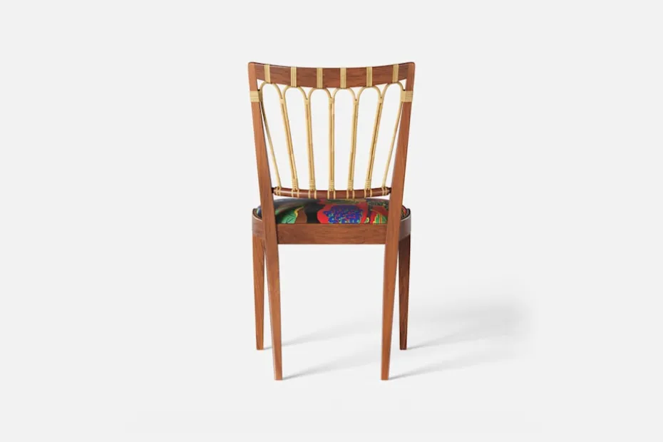 Stol 1165 har en genombruten rygg bestående av lindad rotting. För att skapa en spänning i formen valde Josef Frank ofta att blanda olika träslag och material. Stol 1165 formgavs av Josef Frank 1947.
